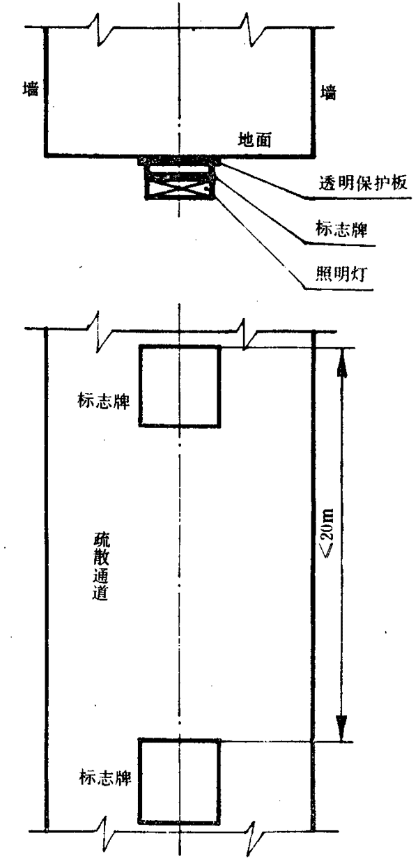 6.10.1.1疏散通道中,“緊急出口”標志宜設置在通道兩側部及拐彎處的墻面上,標志牌的上邊緣距地面不應大于1m,如圖2所示。也可以把標志直接設置在地面上,上面加蓋不燃透明牢固的保護板,如圖3所示。標志的間距不應大于20m,袋形走道的盡頭離標志的距離不應大于10m。
