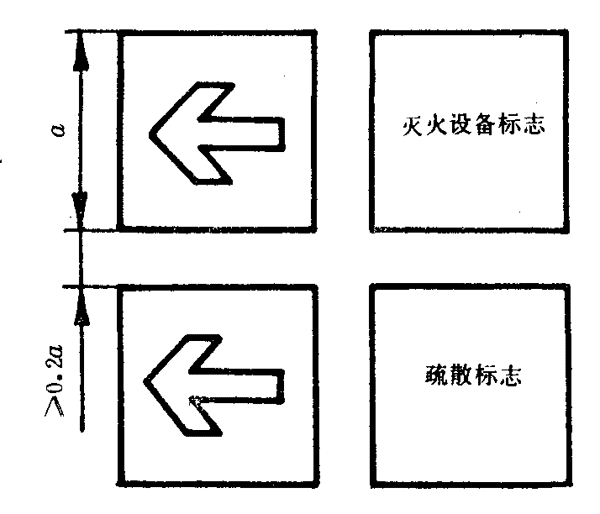 7.2.3當疏散標志與滅火設備標志并列設置并且二者方向相同時,應將滅火設備標志放在上面,疏散標志放在下面。兩個標志之間的間隙不應小于標志公稱尺寸的0.2倍。如圖10所示。