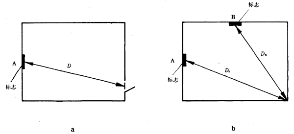 A2 如果要求標志對房間內任何位置站立的觀察者皆保持良好的醒目度,那么應找出最大的觀察距離D,即為房間內離標志最遠位置的觀察者的眼睛至標志的距離。如圖A1b所示,如果標志設在A處,那么最大觀察距離為DA;如果標志設在B處,那么最大觀察距離為DB。