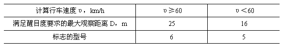 6.11.2.3設置在道路邊緣的警告標志到危險地點的距離,根據道路的計算行車速度,按表1選取。