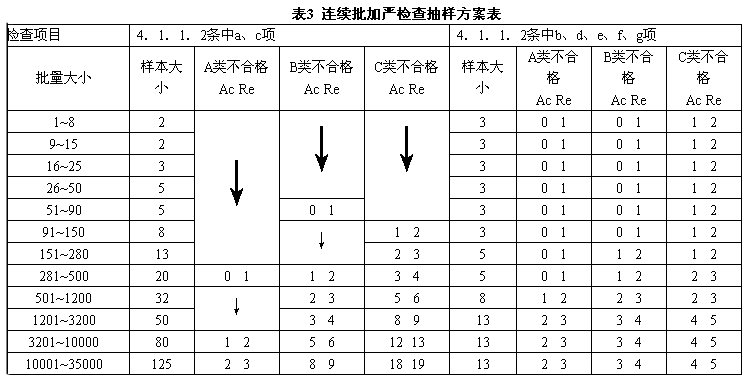連續提交檢查批的質量出現變化時,通過轉移規則進行調整,采用寬嚴程度不同的抽樣方案(見表1、表2及表3)。