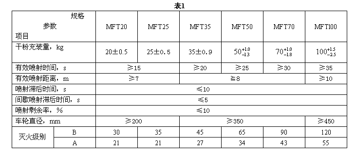 4.1.1 滅火器在20土5℃時,其性能參數應符合表1規定。