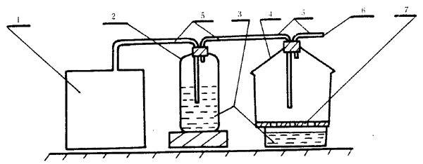 1―供氣穩壓緩沖裝置;2―廣口瓶;3―飽和氯化銨溶液;4―φ250mm增濕器;5―內徑6mm玻璃管;6―空氣出口;7―增濕器孔板