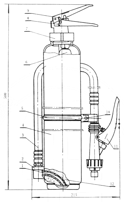 2氣瓶;7―氣頭總成;8―鉛封;9―保險絲;10―自攻螺絲;11―壓把總成;12―干粉滅火劑
