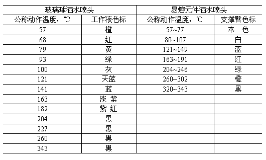 易熔元件灑水噴頭的公稱動(dòng)作溫度分為7檔,應(yīng)在噴頭軛臂上作出相應(yīng)的顏色標(biāo)志。