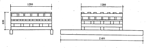 5.23.1.5 試驗(yàn)用的木垛采用刨光的杉木或松木條堆成,如圖9所示。木條尺寸如下:100 mm×150mm×2400 mm的2根,100 mm×100 mm×1200 mm的13根,50 mm×100 mm×1200 mm的28根,木條的平均濕度為6%~14%。整個(gè)木垛應(yīng)預(yù)先稱重。木垛安放在試驗(yàn)室中央的鋼架上。在木垛正下方的地面上.應(yīng)設(shè)置一個(gè)2400 mm×1800 mm×300 mm的長(zhǎng)方形鋼盤,鋼盤應(yīng)不漏水。在試驗(yàn)前注水,并使鋼盤內(nèi)始終保持100 mm深的水。