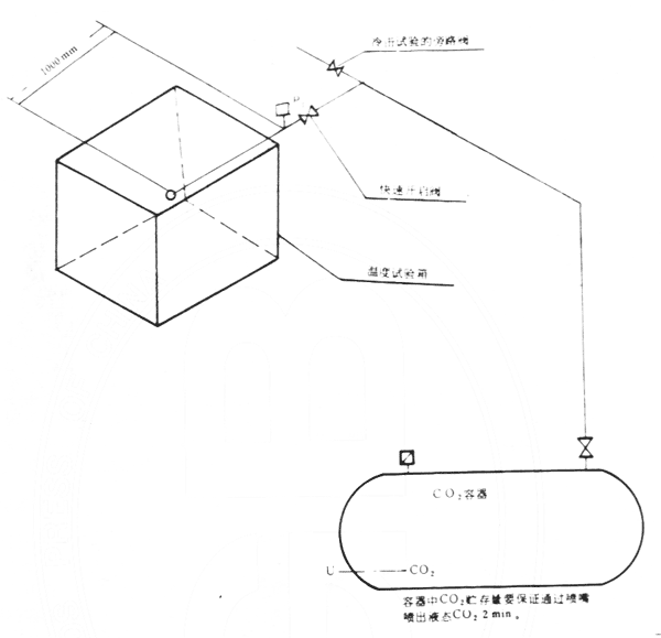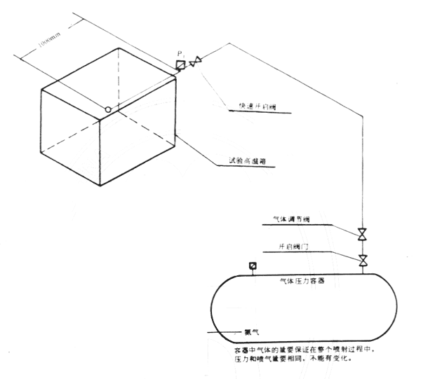 組裝一套試驗系統并在該系統內充裝一定量的鹵代烷滅火劑,并按規定充壓。該試驗系統所貯鹵代烷滅火劑必須保證在試驗的密閉空間內足以達到5%的濃度,其噴射時間亦必須是10±0.5s。
