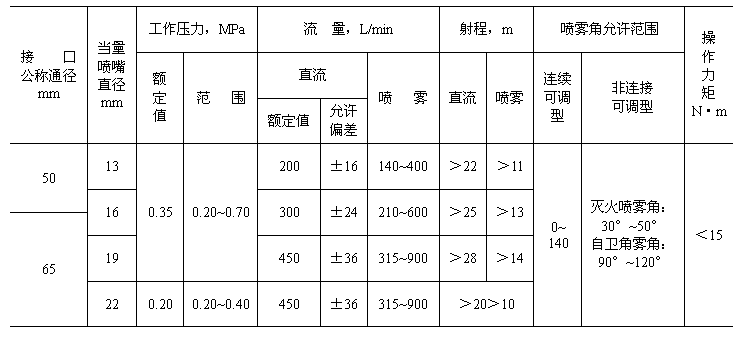 注:對簧片式水槍,額定工作壓力定為0.5MPa,性能參數要求參照上表執行。