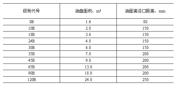 對級別大于10B小于或等于30B的模型,圓盤面積可按0.4m的整倍數擴大,盤內油面離沿口距離150mm;對級別大于30B小于或等于100B的圓盤面積可按1.0m