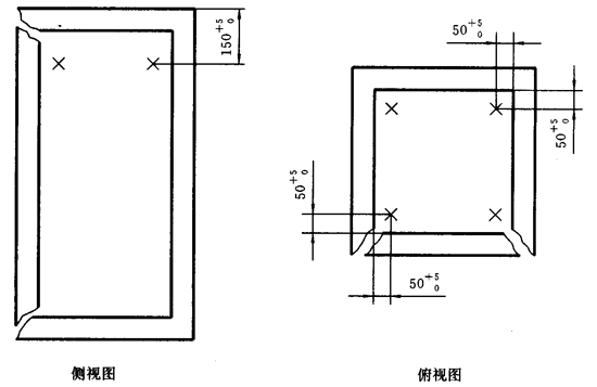 7.2.2.1對單開門的試件,在試件內部布置四個熱電偶。各點的位置為距內頂150mm,距相鄰的內壁各50mm。