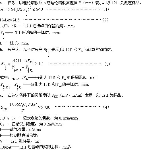 2.1.1.4 檢測器:熱導池檢測器。橋電流為220~240mA(根據雜質含量高低可適當增減);衰減比:雜質用1/1;1211用1/128。
