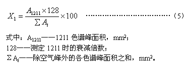 22出峰完畢(保留時間約2.5min),立即把衰減由1/1調為1/128,繼續記錄1211色譜峰(保留時間約3min),待1211色譜峰完畢,再將衰減調回到1/1,記錄1201(保留時間5.2min)、1202(保留時間約7.7min)等雜質峰。用面積歸一法按式(5)計算1211含量X