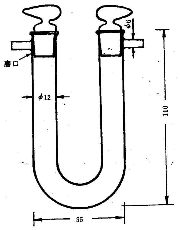 2.2.2.2 具有磨口塞的U型吸收管:見圖1。在紅外燈干燥下,均勻地裝填等量的玻璃棉和五氧化二磷的混合物,裝填量為U型吸收管體積的80%左右。裝填好的吸收管重量要求在40g以內。裝填五氧化二磷后的吸收管口及塞子須擦凈。將U型吸收管存放于干燥器內備用。