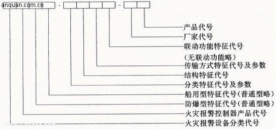 火災報警控制器產品型號的編制,按類組型特征、分類特征及參數、結構特征、傳輸方式特征及參數、聯動功能特征、廠家及產品代號分類,以簡明易懂、同類間無重復、盡可能反映產品特點為原則。