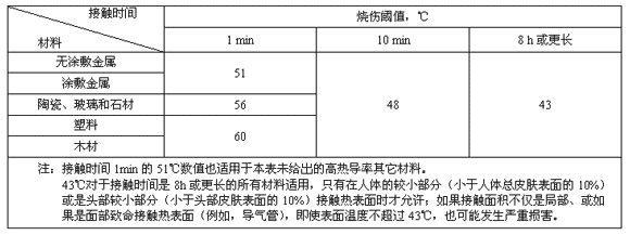 注2:當(dāng)皮膚同熱表面接觸時,如果未超過本標(biāo)準(zhǔn)規(guī)定的燒傷閥值,通常是沒有燒傷風(fēng)險,但是,可能出現(xiàn)疼痛,如果還需要防止疼痛,表面溫度值應(yīng)該以自合適的其他來源。