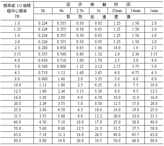 4.20 為保證車間作業(yè)人員良好工作效率的“工效界限”的振動參數(shù)不應(yīng)超過圖1的值。振動容許標(biāo)準(zhǔn)的有效加速度值詳見附錄A(補(bǔ)充件)。