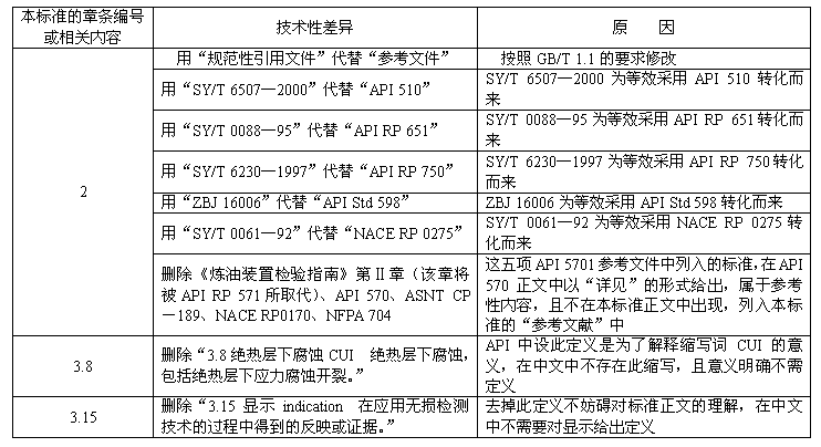 考慮到我國國情,對于API 570(1998年,第二版)做了一些修改,有關技術性差異已編入正文中。在附錄B中給出了這些技術性差異及其原因的一覽表以供參考。