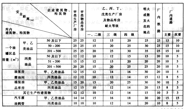 注:①表中未注明的企業(yè)建筑物、構(gòu)筑物與庫內(nèi)建筑物、構(gòu)筑物的安全距離,應(yīng)按現(xiàn)行的國家標(biāo)準(zhǔn)《建筑設(shè)計(jì)防火規(guī)范》執(zhí)行。