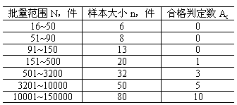 包裝件出廠檢驗(yàn)抽樣數(shù)量n,由包裝件交驗(yàn)批的批量N決定。如無(wú)其他協(xié)議,可從表1中選取適當(dāng)?shù)臉颖敬笮 ?BR> 表1