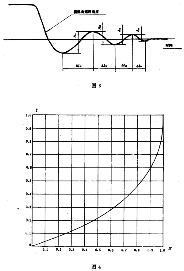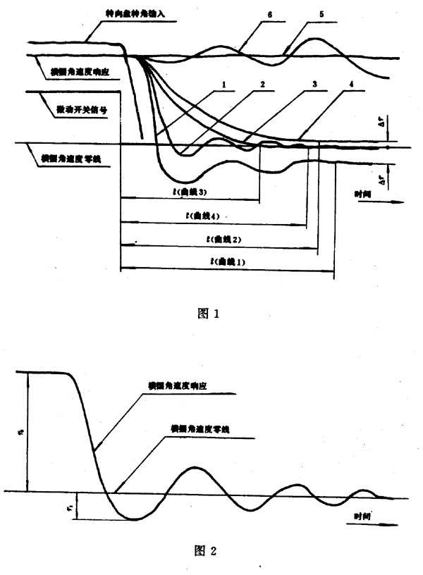 橫擺角速度時間歷程曲線分兩大類:收斂型(圖1中曲線1~4)與發散型(圖1中曲線5、6)。對于發散型,不進行數據處理;對于收斂型,按向左轉與向右轉分別確定下述指標。