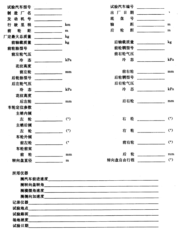 4.1.1 試驗汽車是按廠方規定裝備齊全的汽車。試驗前,測定車輪定位參數。對轉向系、懸架系進行檢查、調整和緊固,按規定進行潤滑。只有認定試驗汽車已符合廠方規定的技術條件,方可進行試驗。測定及檢查的有關參數的數值,記入附錄A(補充件)中。