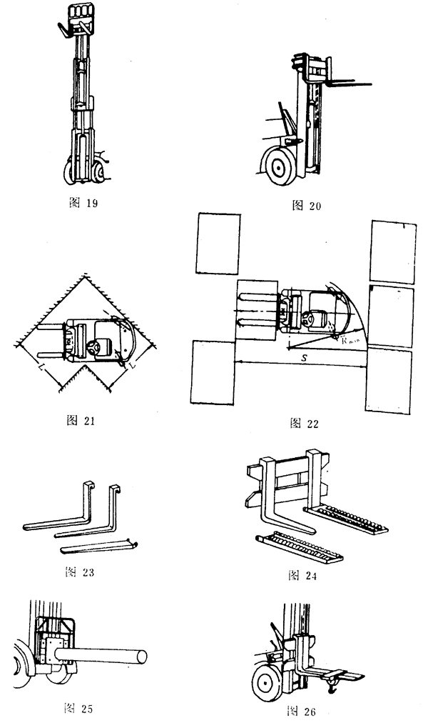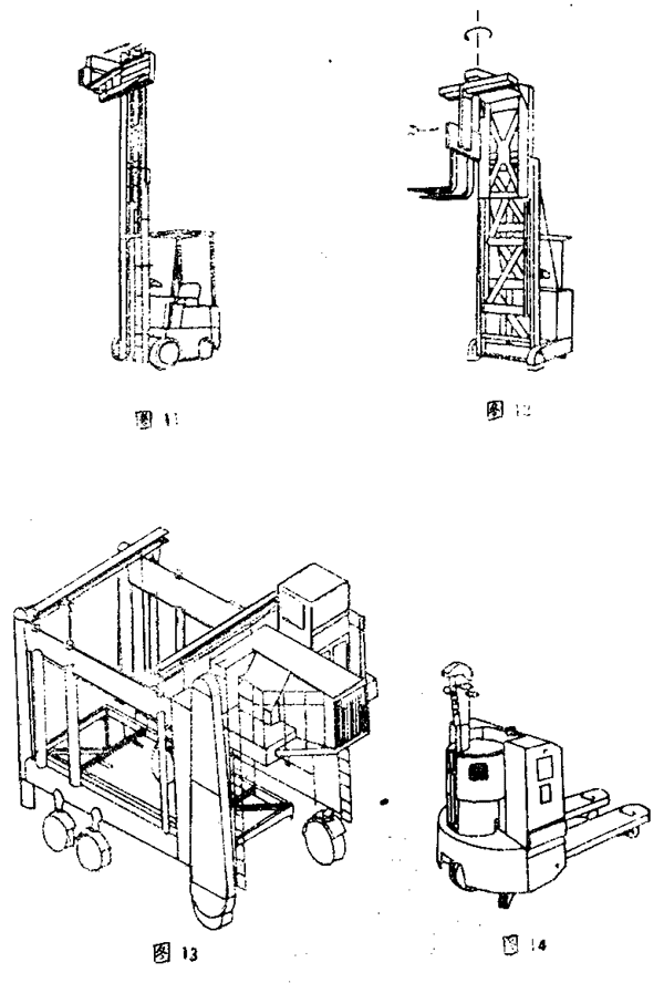 裝有貨叉用來(lái)搬運(yùn)帶托盤(pán)貨物的車(chē)輛(步行式或乘駕式)(圖14)。