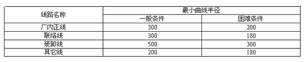 2.1.6 廠內車站應設在平直的線路上,如受地形限制必須設在坡道上,其坡度不得大于1.5‰,現有車站改、擴建時,在特別困難條件下,可設在不大于2.5‰的坡道上。站線曲線半徑不得小于400m,困難時不得小于300m。