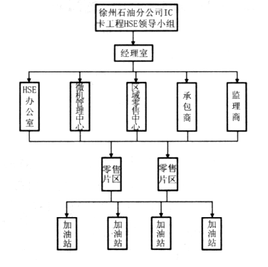 成立IC卡工程HSE領導小組,建立由公司經理室、HSE辦公室、區域零售中心、微機管理中心、零售片區、加油站、承包商及監理等相關人員組成的管理網絡(見圖1),嚴格按照“誰主管、誰負責”的原則,將安全責任逐級分解、強化,明確了各級領導、技術人員、安全管理人員、施工人員及監理人員的責任,確保HSE目標的實現。