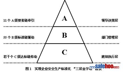危險化學品企業安全生產標準化建設,應根據國家相關政策規定和標準,重點依據《危險化學品從業單位安全生產標準化評審標準的通知》(安監總管三〔2011〕93號),以下簡稱《評審標準》規定要求,筆者以“三層金字塔”的建設形式,積極引導企業開展安全標準化達標創建工作。