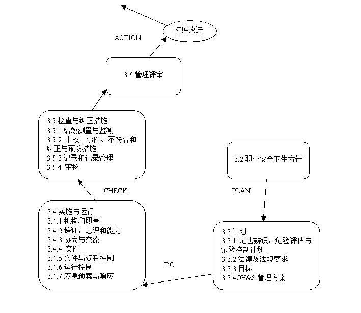 OHSMS的基本思想是實現體系持續改進,通過周而復始地進行“計劃、實施、監測、評審”活動,使體系功能不斷加強。它要求組織在實施職業安全衛生管理體系時始終保持持續改進意識,對體系進行不斷修正和完善,最終實現預防和控制工傷事故、職業病及其它損失的目標。