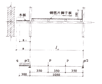 1.3 本設(shè)計中所采用的腳手板為深圳地區(qū)使用較為廣泛的鋼笆片,其自重標(biāo)準(zhǔn)值為0.125kN/m2。具體做法是(如圖2),在兩立桿間的橫向水平桿上等距設(shè)置四根縱向水平桿,將鋼笆片用鉛絲固定在這四根縱向水平桿上。橫向水平桿的外伸部分采用木腳手板,其自重標(biāo)準(zhǔn)值為0.35kN/m2。