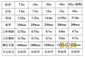 樓層板底支撐常規(guī)高支模滿堂腳手架設置。其不同樓層板底模板支撐間距見表1。