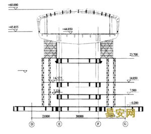 5.樓層層間高:1~2層層高7.5m,3~4層層高15m,○E~○F軸外懸挑梁段高度達45m。