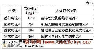 建筑施工現(xiàn)場最常見的觸電事故是電擊傷害。人體遭受電擊后對人體造成的傷害程度取決于流經(jīng)人體的電流強度、持續(xù)時間、電流通過人體內(nèi)部途經(jīng)、電流頻率、人體狀況和觸電現(xiàn)場的條件等。流經(jīng)人體的50Hz交流電電流按照人的感覺程度如下表所示: