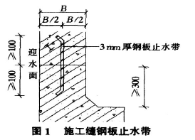 2)采用中置式鋼板止水帶時(shí),止水帶應(yīng)垂直放置于施工縫的正中間位置并固定牢固,其翼緣應(yīng)朝向迎水面,以更好的起到止水作用(見圖1)。