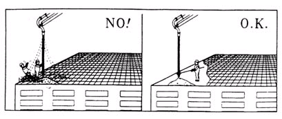 ????13.絕對(duì)不允許站在建筑物邊緣手握末端軟管作業(yè),杜絕軟管或臂架的搖擺導(dǎo)致操作人員的墜落事故。在建筑物邊緣作業(yè)時(shí)操作人員必須站在安全位置用適當(dāng)?shù)妮o助工具引導(dǎo)末端軟管。如圖4所示: