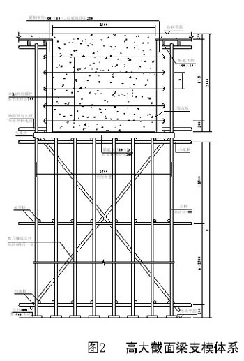 4、為保證高大截面梁支模體系有足夠的剛度和穩定性,在梁兩側立桿、水平搭完后,沿梁跨度方向分別搭設連續剪刀撐,上端與梁底水平桿連接,下端與掃地桿連接,中間分別與立桿、水平桿連接。