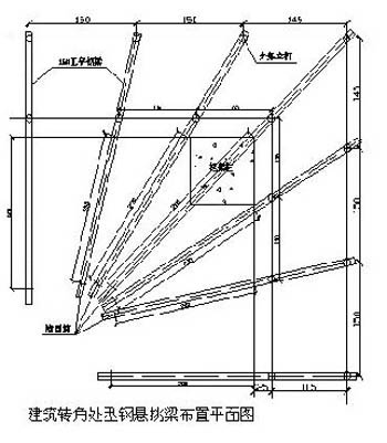 施工現場的型鋼懸挑外架在立面的轉角處的處理方法一般采用輻射式布置型鋼梁,這在小截面的角柱情況尚可行,但通常高層建筑的框架柱截面較大,采用輻射式布置型鋼梁,一般會遇到1-3根的型鋼懸挑梁布置在框架柱內,這使行柱筋偏位,柱內的型鋼梁處的砼不密實,影響框架柱的質量,有可能造成重大安全隱患。且采用輻射方式布置型鋼梁的方法,使得外架轉角處的立桿間距布置不一,個別內立桿未能落在型鋼梁上,成為虛腳現象。因在轉角處采用輻射梁布置,使得懸挑梁的長度較長,在無塔吊配合情況下,拆除型鋼梁相當不便,或只能將型鋼梁割短后再拆除。因此建議在外架的轉角處的型鋼挑梁改用型鋼三角挑架。