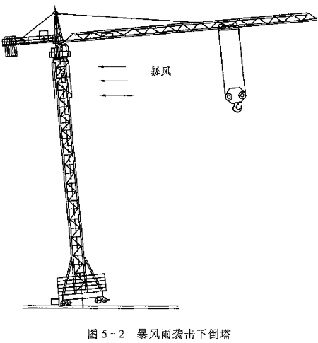 (10)行走式塔機因下班后忘記鎖夾軌器,晚上突遭風暴襲擊而倒塔(見圖5—2)。