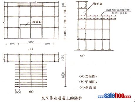 3m~6m,且寬于出入通道兩側各1m的防護棚,棚頂滿鋪雙層不小于5cm厚的腳手板,非出入口和通道兩側必須封嚴。