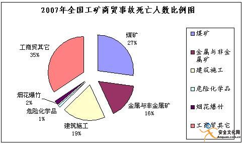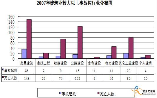 2007年全國建筑業(yè)共發(fā)生傷亡事故2278起,死亡2722人,同比增加48起,上升2.2%,死亡人數(shù)增加176人,上升6.9%(房屋建筑與市政工程施工安全事故840起,死亡1011人,同比下降5.4%和3.53%。其中,較大以上事故38起,同比下降2.5%;死亡159人,同比上升8.9%)。其中,發(fā)生較大事故96起,死亡357人,同比減少7起,下降6.8%,死亡人數(shù)減少26人,下降6.8%;發(fā)生重大事故5起,同比增加4起,上升400%,死亡55人,同比增加44人。發(fā)生特別重大事故2起,死亡99人,同比增加2起、99人。建筑業(yè)事故起數(shù)和死亡人數(shù)分別占工礦商貿(mào)企業(yè)總數(shù)的19.18%和19.60%。