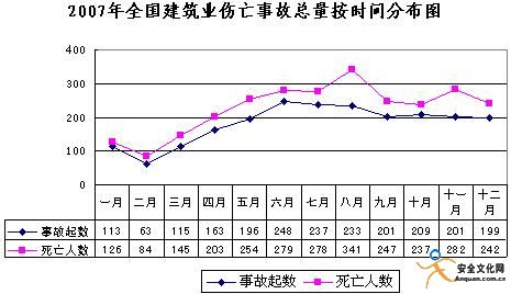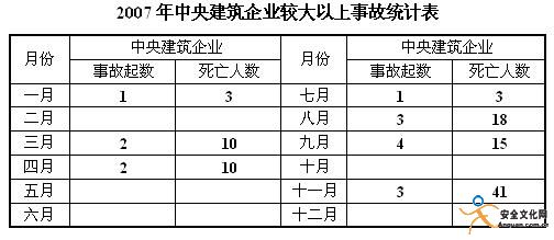 3.坍塌和高處墜落事故仍是事故多發(fā)的主要類型。2007年坍塌和高處墜落事故共發(fā)生1257起,死亡1574人,分別占總量的54%和58%。其中較大事故共49起,死亡197人,分別占較大事故總數(shù)的51.0%和55.1%;重大以上事故4起,其中2起一次死亡10人以上重大事故和2起一次死亡30人以上特別重大坍塌事故,造成122人死亡。3月至11月份平均每月發(fā)生5起較大坍塌事故。