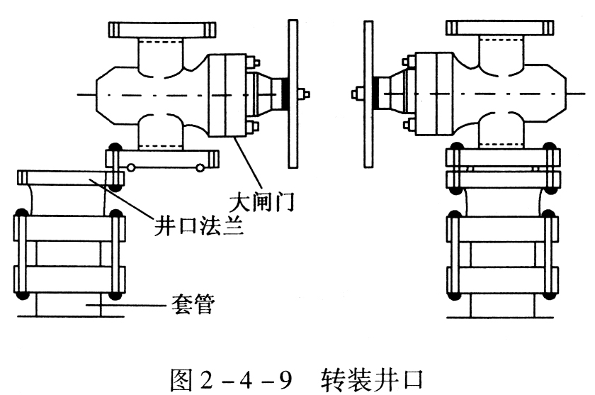 見圖2-4-9。在井口天然氣流噴量及壓力較小的情況下,也可以采取轉裝法,即把大閘門的閘板全部打開,與井口錯位(避開天然氣流),先將閘門法蘭和井口法蘭連接好一個螺栓,然后在閘門手輪上綁上油管,用人力旋轉180°,即可使閘門中心正對主氣流中心,讓天然氣流經閘門中孔上噴,此時突擊隊員立即進入,穿好并緊固好所有螺栓后,關閉閘門,達到控制井口的目的。