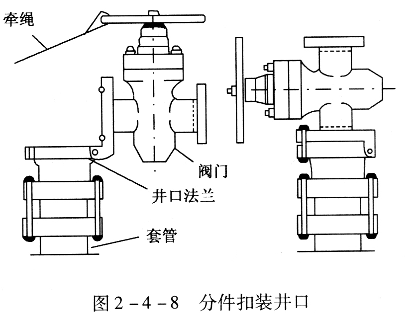 見圖2-4-8。在井口天然氣流噴量及壓力較小的情況下,可以采取扣裝的辦法,將一個大閘門扣裝在井口法蘭上。首先把閘板全部打開,并避開井口天然氣流,將閘門與井口法蘭之間連接好一個鉸鏈,然后用繩系將閘門拉動,使其翻轉90°,扣裝在井口上,突擊隊員立即進入,穿好并緊固好所有螺栓后,關閉閘門,即可控制井噴。