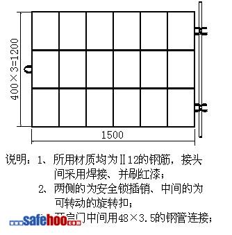 電梯井筒內每隔一層在入口處設置用鋼管及木板搭設的平臺,平臺上均不得存有雜物。電梯井內不準做垂直運輸通道或垃圾通道。電梯井門按下圖制作: