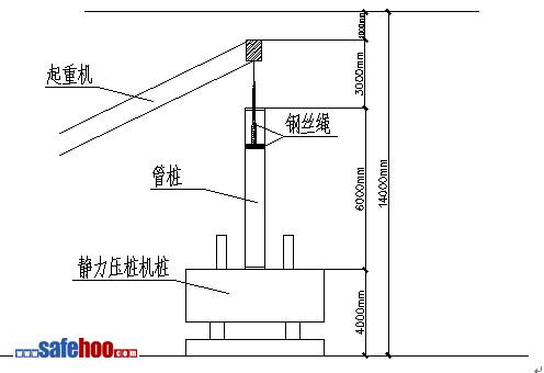 現場的靜壓樁機放置管樁的高度為4米,采用6米或者6米以內的管樁,加上約3米起吊管樁的鋼絲繩長度,再加上1米左右的起重機的活動高度,共14米,也就是靜壓樁機的最大允許工作高度為14米,如圖所示