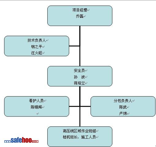 項目部建立以項目經理為組長,技術負責人,專職安全員為副組長,各樁機機長和班組長組成的項目安全生產領導小組。在高壓線區域施工時,專設一名專職看護人員,查看起重臂伸出時的標記和工作角度,加強日常機械設備、鋼絲繩、工人是否違章操作進行監督檢查。在項目部形成縱橫網絡管理體系,對安全生產實施統一領導,保證安全生產的重大技術措施進行決策。(如下圖)?