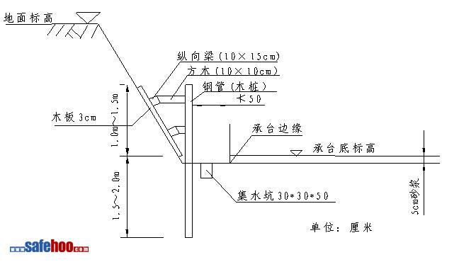 2.1.2基坑四周設(shè)置排水溝、集水坑,用抽水機或潛水泵及時將坑內(nèi)積水排除。當(dāng)施工便道距基坑較近時,便道與基坑之間設(shè)置1m寬的護道,并在基坑周圍設(shè)置截水溝防止水流入基坑。