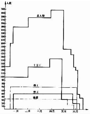 根據各個時間需要耗用的人工,繪制成勞動力耗用動態圖(見圖2-10-1)。