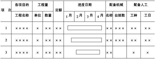 (2)施工進度計劃的表示方法進度計劃可用文字說明或用表格形式來表示。由于用表格形式能綜合反映各方面情況和要求,所以較多采用“進度計劃表”的形式來表示(見表2-10-1)。